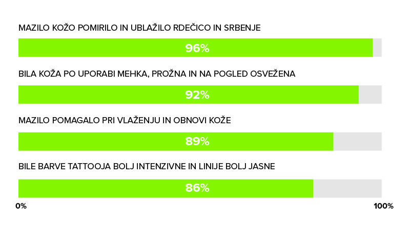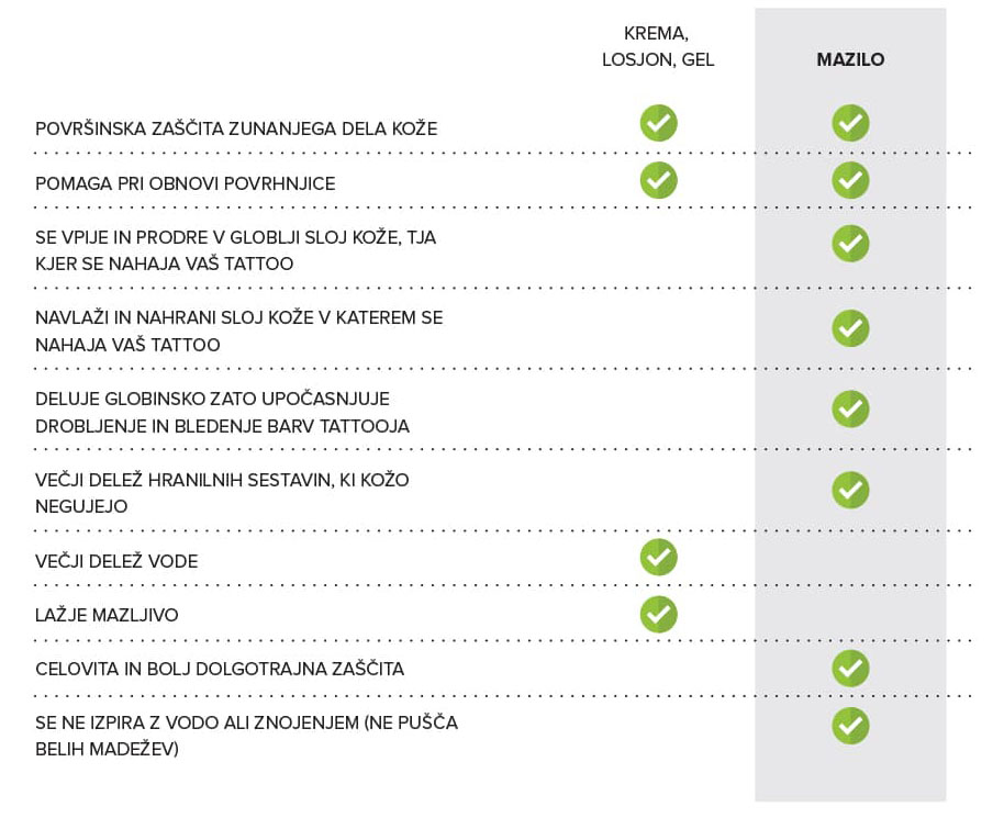 Na tetovažu nanesi mazilo i dobro ga razmaži. Ako je tetovaža veća, preporučujemo da mazilo naneseš na nekoliko mjesta, a zatim ga dobro razmažeš po cijeloj površini. Učinak djelovanja vidljiv je već nakon nekoliko minuta — koža postaje elastičnija i svježija na pogled. Ako boje tvoje tetovaže nisu previše oštećene ili izblijedjele, ponovno će doći do izražaja i izgledati intenzivnije. Uz redovitu upotrebu (najmanje 2 puta tjedno), tvoja će tetovaža zadržati svjež i sjajan izgled, a usporit će se pucanje pigmenta i blijeđenje tetovaže.