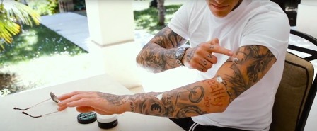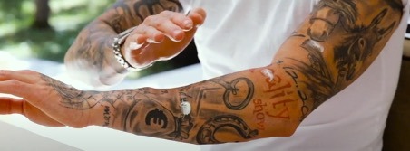 Prije prvog nanošenja masti na svježu tetovažu, nježno je isperite mlakom vodom (bez korištenja sapuna). Osušite je na zraku ili nježno obrišite papirnatim ručnikom. Čistim rukama nanesite tanak sloj Tattoo Care masti. Budući da je mast po strukturi gušća od kreme, pokušajte je nanijeti tako da prstom uhvatite mast i tapkanjem nanesete na tetovažu (slika ispod).