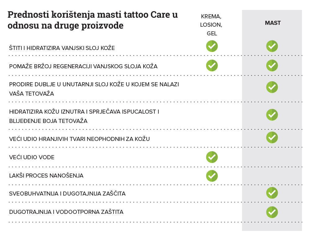 Da. Tattoo Care masti razvili su farmaceuti u suradnji s profesionalnim tattoo majstorima. Cilj je bio razvoj visoko učinkovite masti za njegu tetovaže koja se može koristiti od prvog dana. Masti za njegu tetovaže izrađene su od prirodnih sastojaka koji dubinski vlaže vašu kožu i ubrzavaju njezinu regeneraciju, umiruju je i hrane te smanjuju crvenilo izazvano postupkom tetoviranja. Prije prvog nanošenja masti na svježu tetovažu, nježno isperite tetovažu mlakom vodom (bez upotrebe sapuna). Osušite je na zraku ili nježno obrišite papirnatim ručnikom. Čistim rukama nanesite tanak sloj Tattoo Care masti i ponovite postupak najmanje 3 puta dnevno. Budući da je struktura masti gušća od kreme, pokušajte je nanijeti tapkanjem na tetovažu (ostavite je da se na trenutak ugrije temperaturom vašeg tijela) i zatim je lagano razmažite.