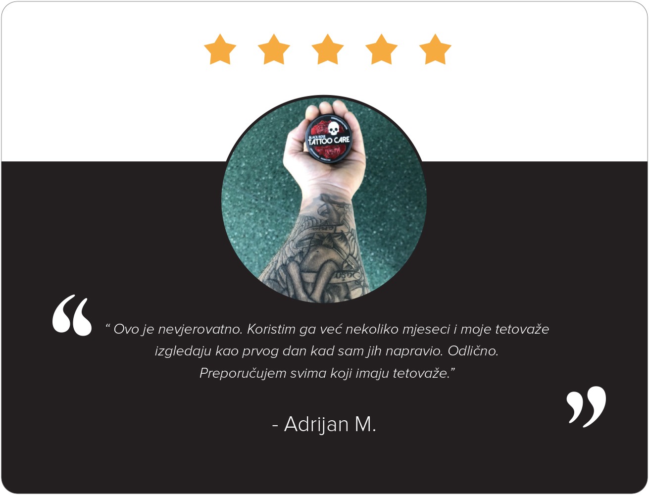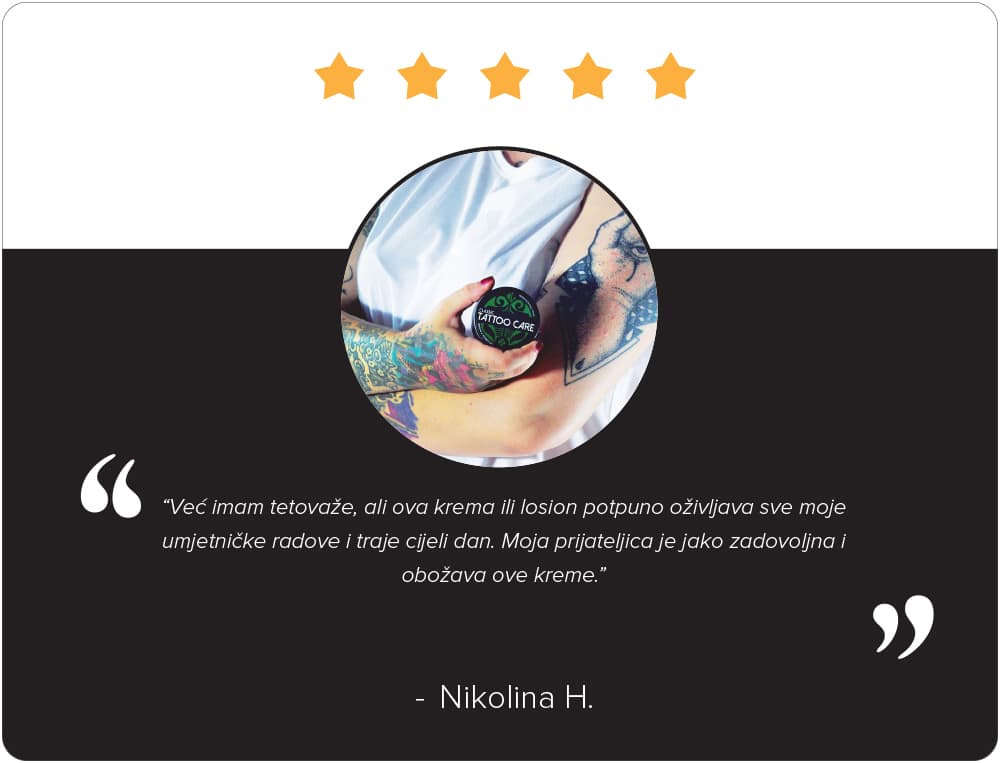 Da. Tattoo Care masti razvili su farmaceuti u suradnji s profesionalnim tattoo majstorima. Cilj je bio razvoj visoko učinkovite masti za njegu tetovaže koja se može koristiti od prvog dana. Masti za njegu tetovaže izrađene su od prirodnih sastojaka koji dubinski vlaže vašu kožu i ubrzavaju njezinu regeneraciju, umiruju je i hrane te smanjuju crvenilo izazvano postupkom tetoviranja. Prije prvog nanošenja masti na svježu tetovažu, nježno isperite tetovažu mlakom vodom (bez upotrebe sapuna). Osušite je na zraku ili nježno obrišite papirnatim ručnikom. Čistim rukama nanesite tanak sloj Tattoo Care masti i ponovite postupak najmanje 3 puta dnevno. Budući da je struktura masti gušća od kreme, pokušajte je nanijeti tapkanjem na tetovažu (ostavite je da se na trenutak ugrije temperaturom vašeg tijela) i zatim je lagano razmažite.