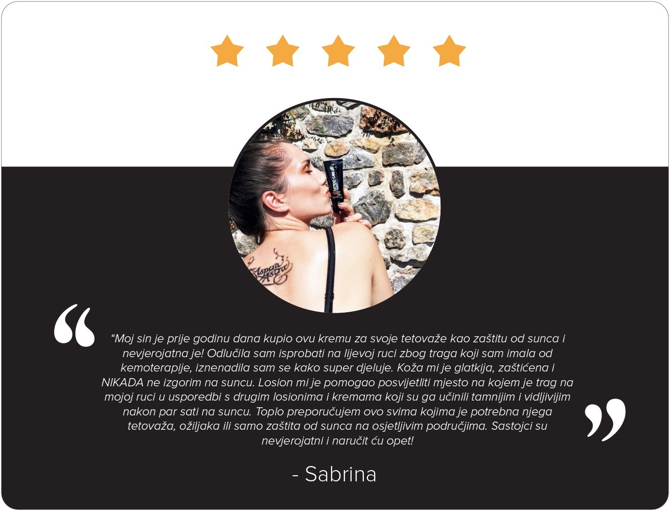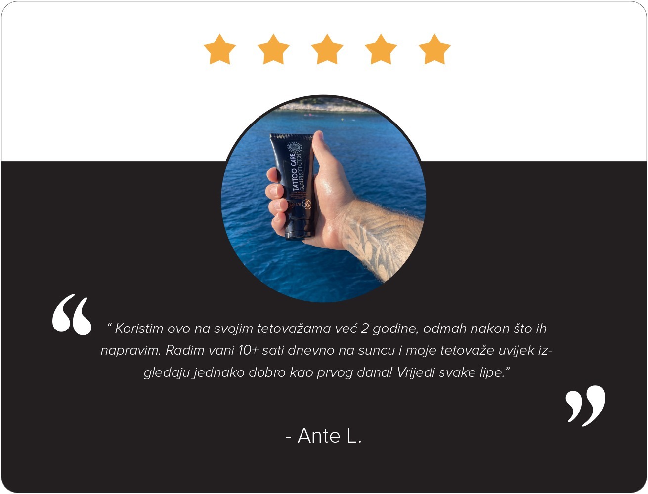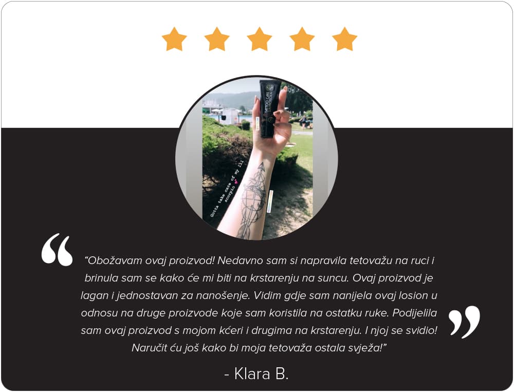 Mast za zaštitu od sunca jedna je od naših najboljih masti i vrlo je popularna u našoj zajednici tijekom cijele godine. Ima iznimna zaštitna svojstva i ljudi je vole pokazivati po plaži. Najbolji pokazatelj zadovoljstva su ocjene naših kupaca diljem svijeta. Na jednom od najkonkurentnijih tržišta u SAD-u, naše masti su među najprodavanijim proizvodima za zaštitu tetovaža. Prosječna ocjena kvalitete naših masti i zadovoljstva korisnika, na temelju više od 3000 ocjena je 4,6 od 5. Usporedimo li taj rezultat s ocjenama u školi, možemo reći da su naše masti odlične kvalitete.