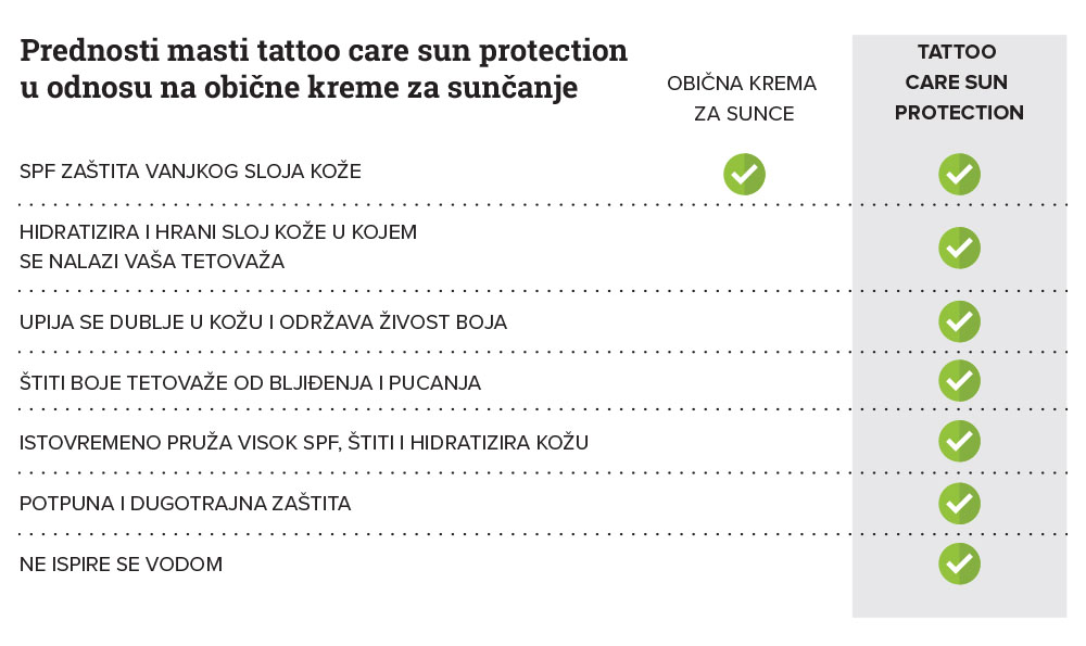 Zbog svog sastava, Tattoo Care Sun protection je klasificiran kao mast. Masti su prirodni ovlaživači. Tattoo Care Sun Protection ne samo da će zaštititi vašu tetovažu od sunca i njezine boje od blijeđenja, već će i dubinski navlažiti vašu kožu što će joj pomoći da se brže pomladi. Nahranjena koža je najvažniji čimbenik u očuvanju ljepote i života vaše tetovaže.